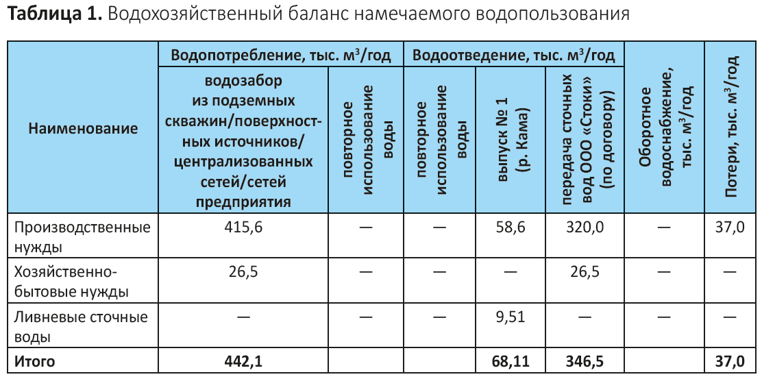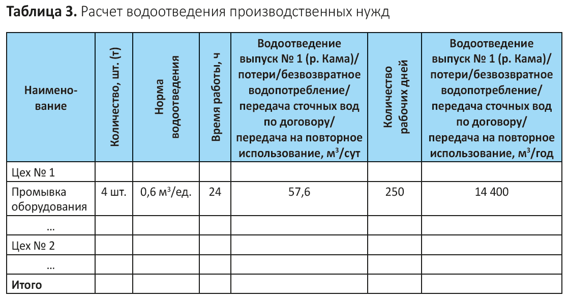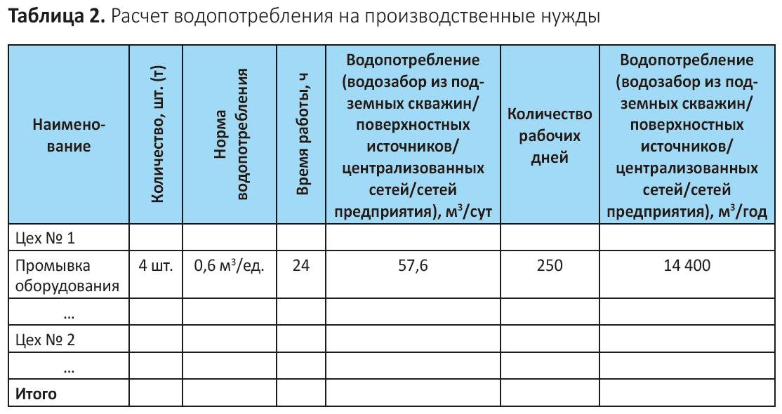 Обратите внимание: если на предприятии имеется сразу несколько видов водозабора, их можно вынести в отдельные графы таблицы. Формат таблицы может меняться в зависимости от производства
