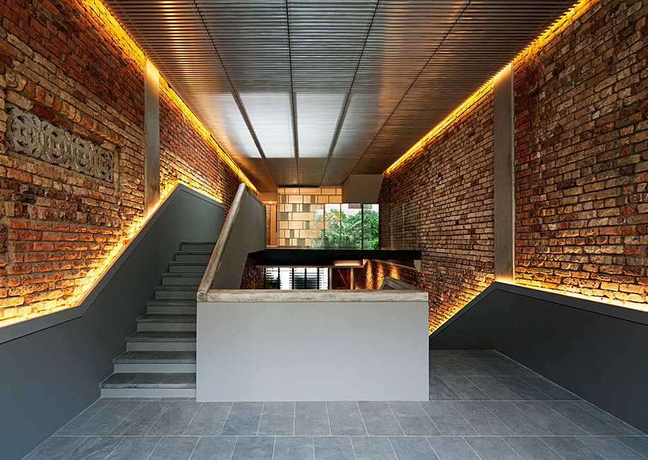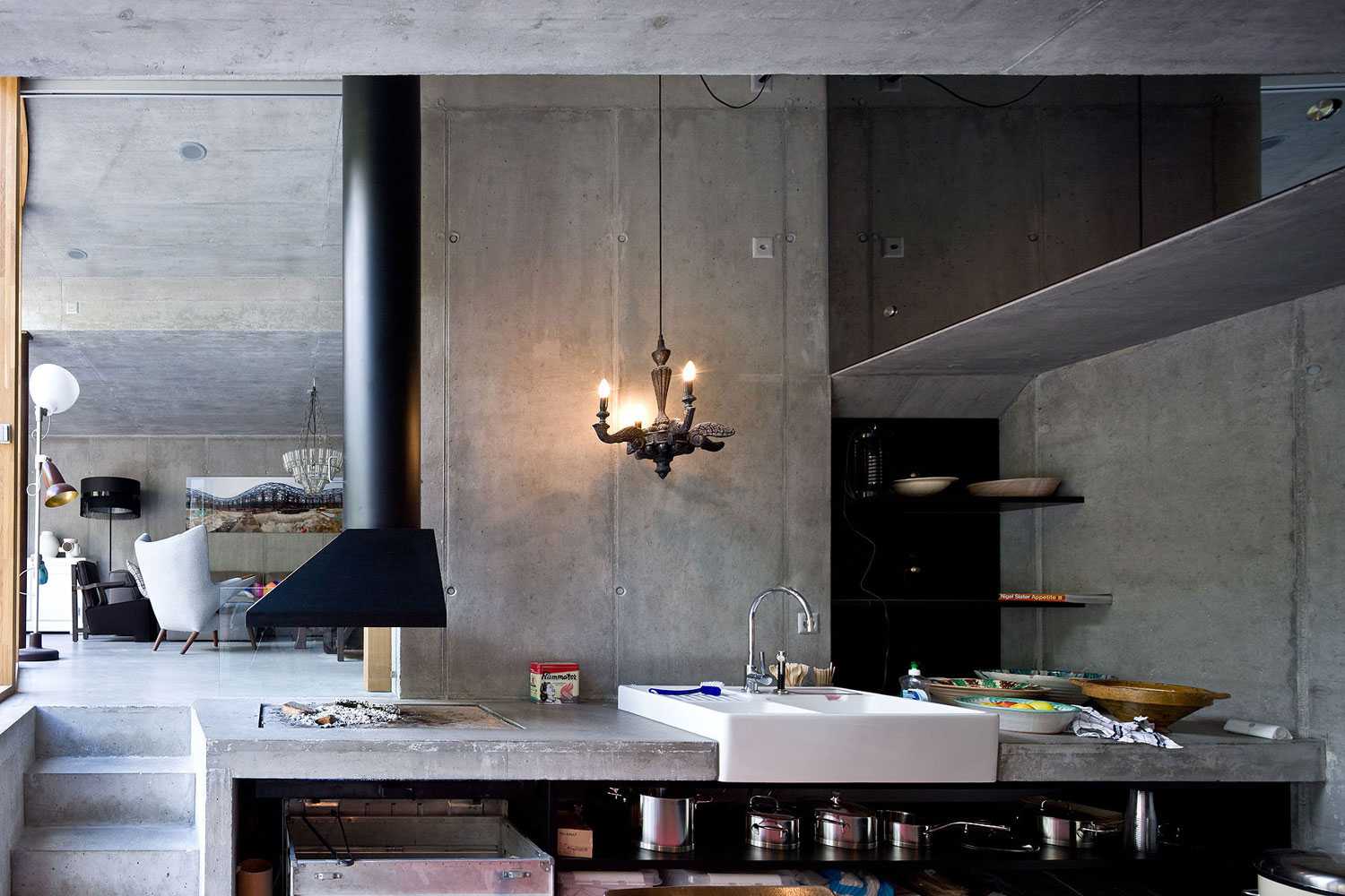 Использование стали в домашнем интерьере – это еще один тренд современности. С помощью перфорированных листов создается сложная геометрия потолка, в котором основное место, разумеется, выделено бетону.