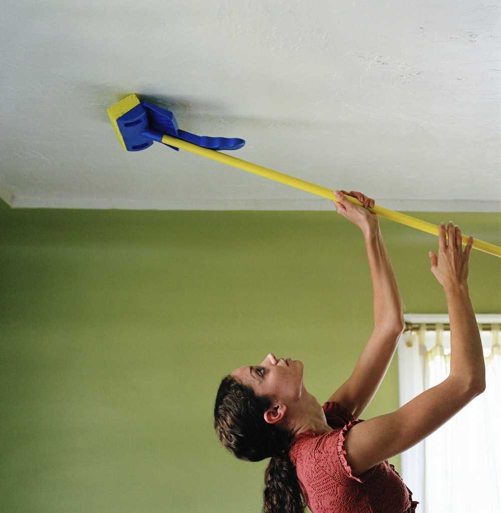 Прежде чем браться за тряпку, по запылившейся поверхности потолка следует предварительно пройтись пылесосом с мягкой ворсистой щеткой-насадкой. В некоторых случаях, когда на потолке нет сажи и копоти, этого бывает достаточно. Использовать пылесос очень удобно: длина шланга позволяет в квартирах со стандартной высотой потолка обойтись без дополнительных приспособлений и стремянок, а мощный поток воздуха хорошо втягивает примагниченную пыль и паутину.