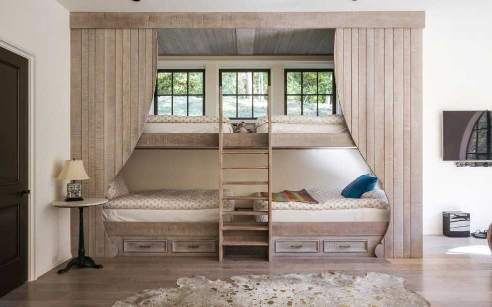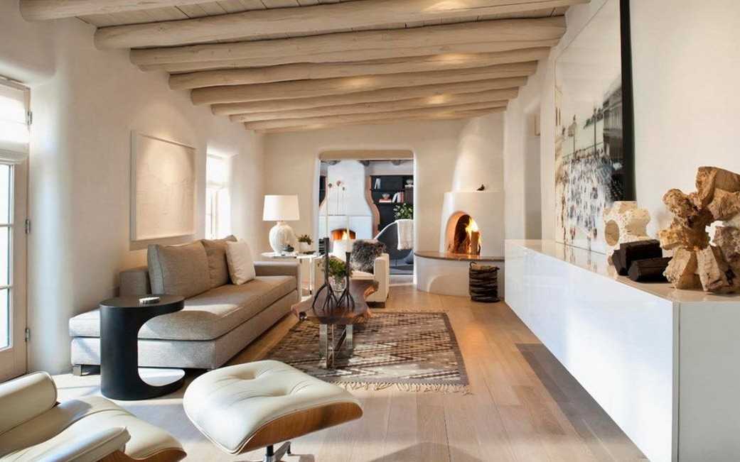 В комнате с беленым деревом можно использовать другие расцветки натурального материала: белый ясень, молочный или натуральный дуб, горная лиственница. На фоне беленого фона красиво смотрится красное дерево. Благодаря ему атмосфера помещения оживает.