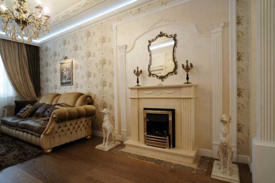 Каминная зона в классическом стиле – лучший вариант для кухни гостиной с классическими элементами. Гобеленовая обивка дивана для зоны отдыха, зеркала, резные детали фасада кухонного гарнитура идеально сочетаются с каминными часами, золочеными деталями, белым камнем камина.