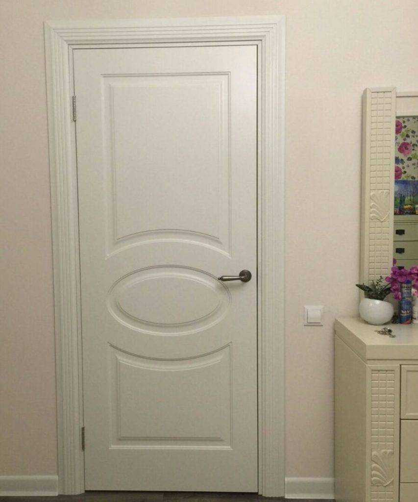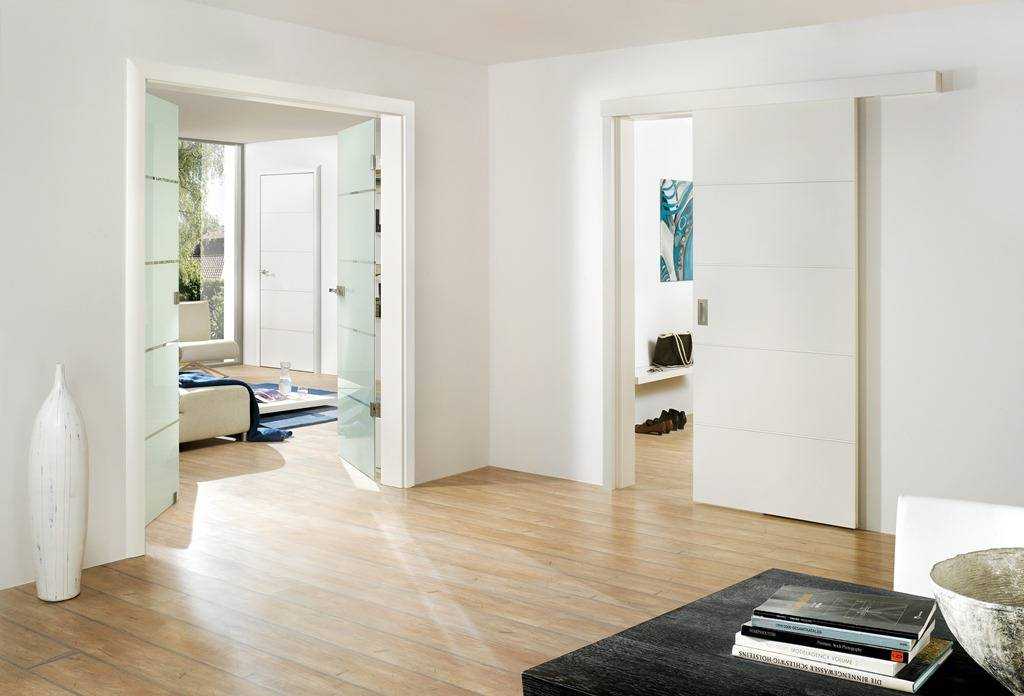 Самый простой вариант, когда выбор отдается в пользу гладких белых дверей. Полотна окрашиваются белой эмалью либо обшиваются панелями МДФ, ламинатом. Такие модели дверных конструкций недорого стоят, используются в офисах и помещениях, предназначенных для проживания.