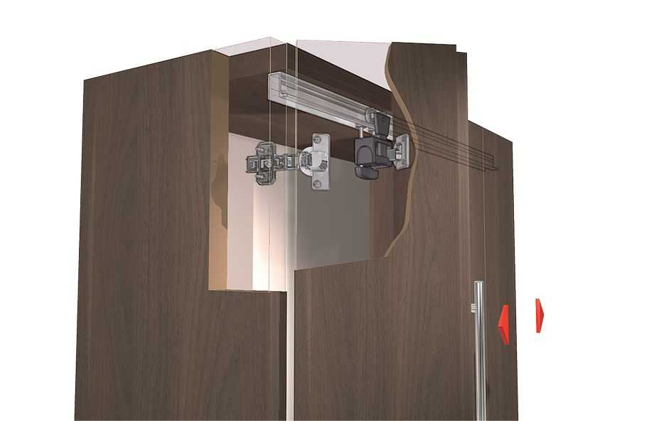 Для шкафов со складными дверями, из-за сложной конструкции, деталей фурнитуры больше: это рельсы, роликовые механизмы, уплотнители, петли, ручки, зажимы и фиксаторы.