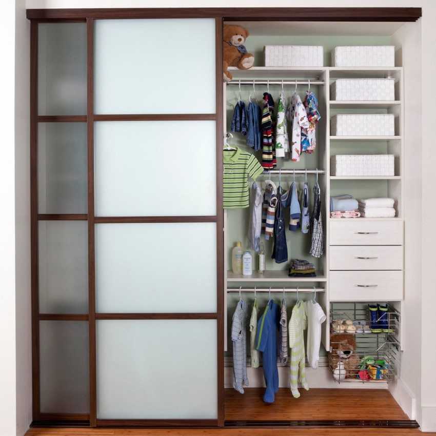 Рамки панелей — тоже из металла. Материал самой мебели имеет значение: панели — из ЛДСП, МДФ или высокопрочного пластика. Встречаются и деревянные створки, но они тяжелее и могут сломаться. Фасад может быть декорирован чем угодно — от ткани до бамбука и стекла. Чтобы система хранения прослужила дольше, бережно пользуйтесь складывающимися створками, объясните детям, чтобы не катались на дверцах.