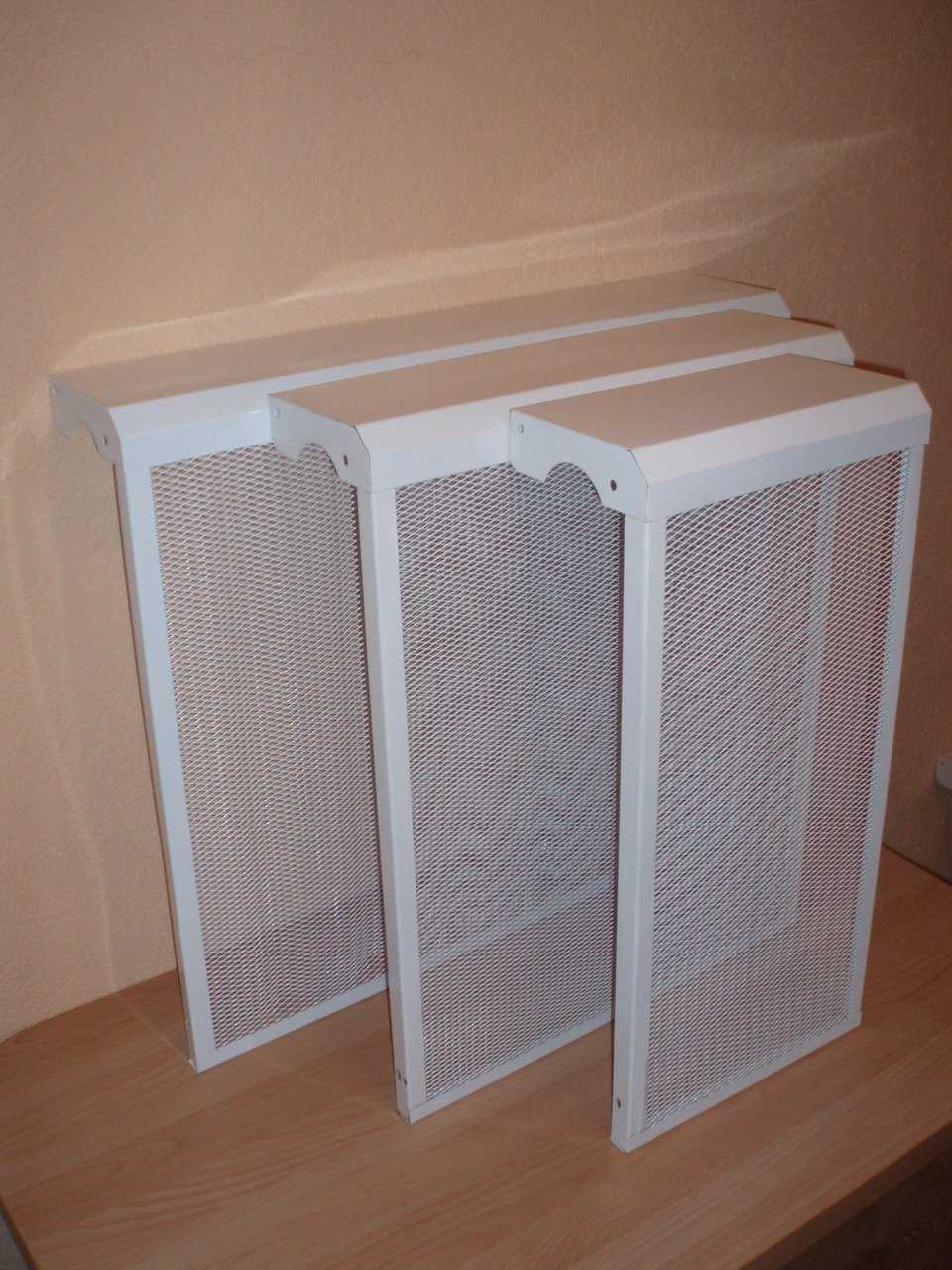 Металлический элемент не препятствует качественному теплообмену. Выполненный из алюминиевой или стальной сетки короб, замечательно пропускает тепло. Подобные изделия очень просты при монтаже. Они бывают украшены разнообразными рисунками. Например, ажурной решеткой или сплошным полотном с открытым пространством.