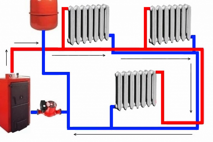 Достоинства конструкции неоспоримы: малый объем теплоносителя, в качестве которого можно использовать не только воду, меньший расход труб, диаметр которых меньше, чем в предыдущем случае. Возможность регулирования температуры нагрева радиаторов, батареи могут быть любого типа с любым диаметром трубы. Основной недостаток – зависимость от подачи электричества, с помощью которого работает насос.