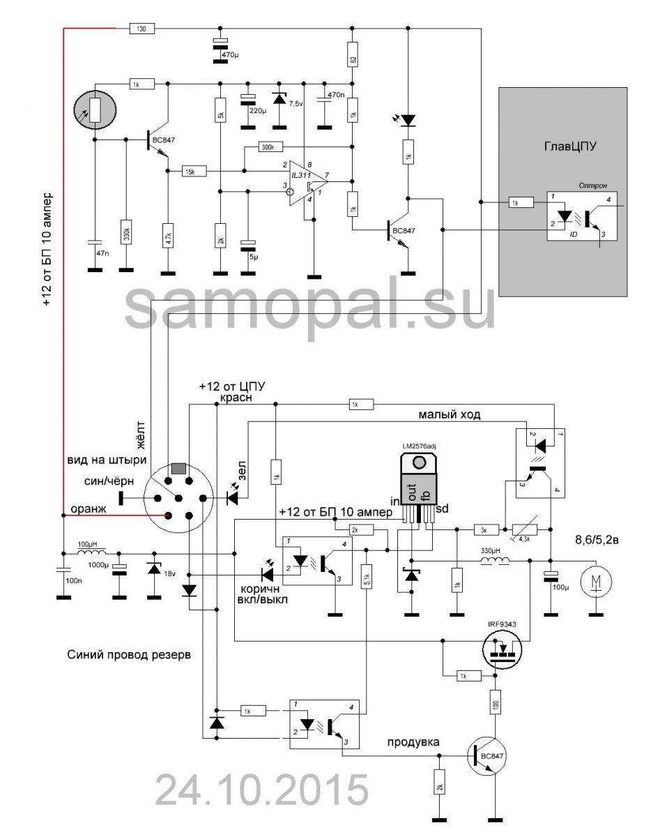 Нихняя часть схемы — это управление турбиной наддува. Управление осуществляется двумя сигналами низкого уровня. Если на обоих входах единицы, то турбина выключена. При подаче низкого (по сравнению с +12 ЦП) уровня на вход «малый ход» на турбину подаётся полное напряжение питания через полевой транзистор. Этот режим используется при продувке остатков горения в горелке перед очередной загрузкой и розжигом.