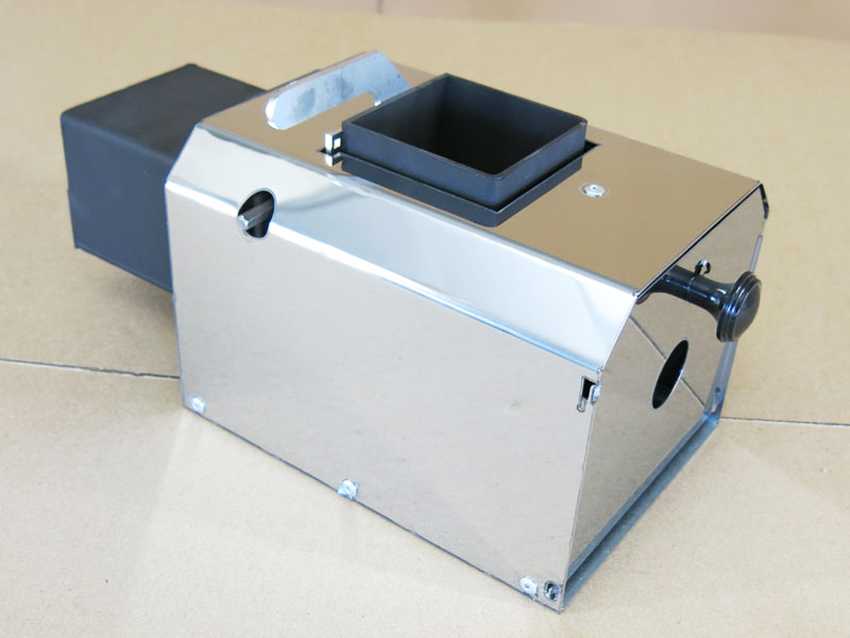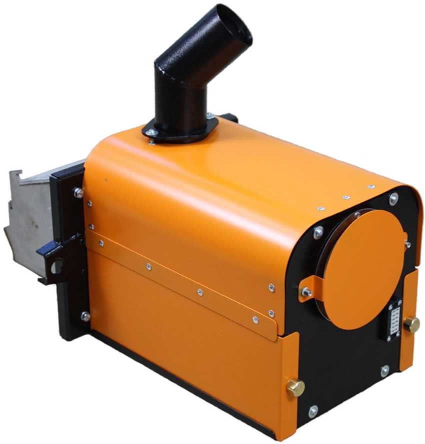 Камера сгорания из круглой или квадратной трубы внутри имеет поддон для горящего топлива, а сверху – патрубок со шнековым конвейером для дозированной подачи опилок, гранул или другого мелкофракционного энергоносителя. Камера крепится к фланцевой плите, которая прилегает снаружи к фронтальной плоскости котельного агрегата.