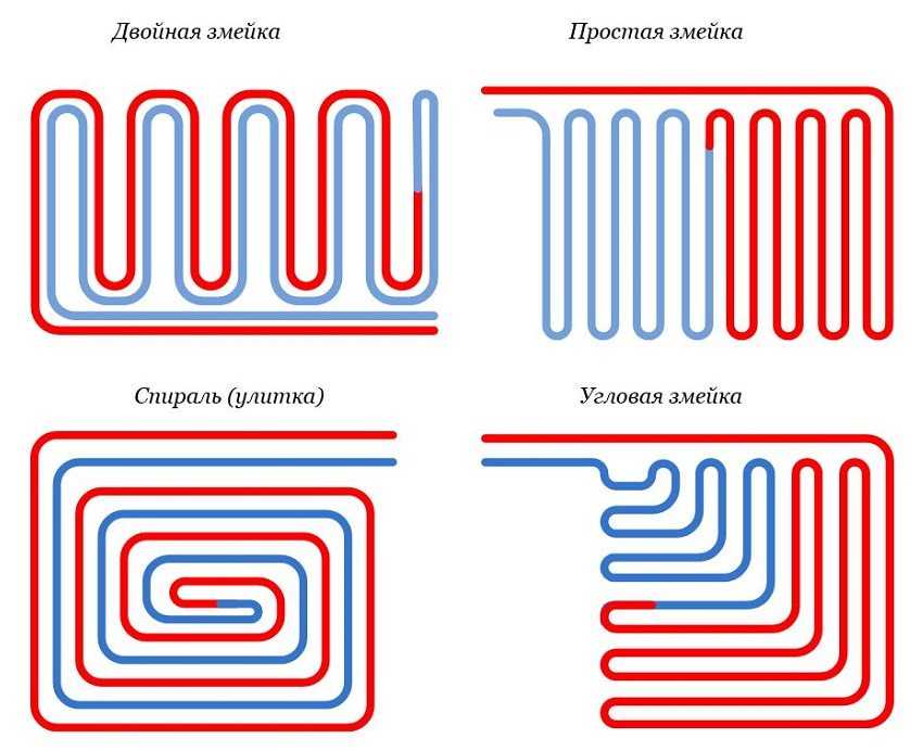 Варианты укладки труб: простые, угловые или двойные петли (змейки), спирали (улитки). Для узких коридоров и помещений неправильной формы используют укладку змейкой. Большие площади разбивают на сектора. Допускается комбинированная укладка: в краевой зоне труба выкладывается змейкой, в основной части — улиткой.