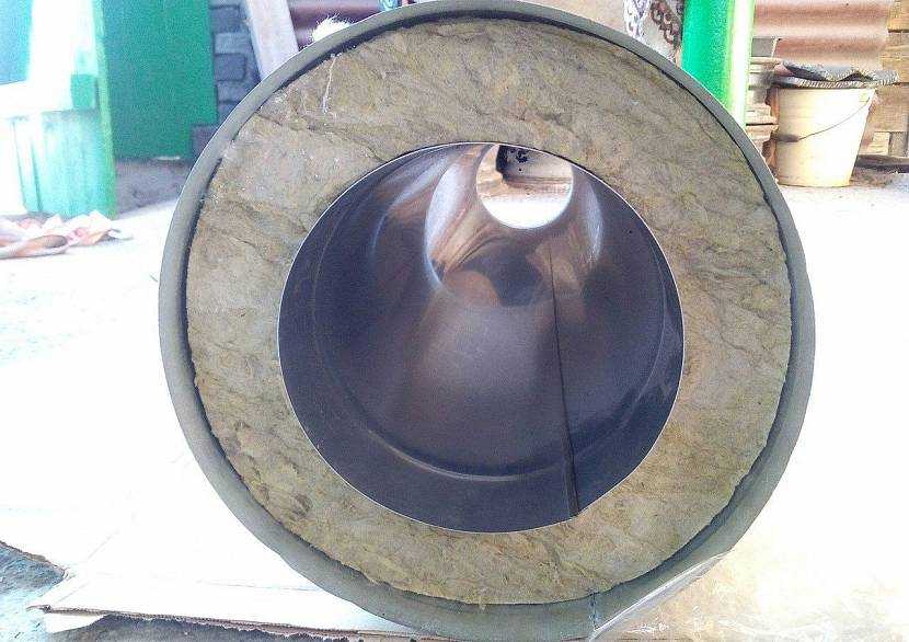 - Внутренний слой — нержавеющая сталь. Этот материал подходит больше всего, поскольку подвержен минимальным деформациям при нагреве. Толщина стенки должна быть достаточно большой для того, чтобы труба, на которую в дальнейшем будет наложен утеплитель, не прогорела быстро.
