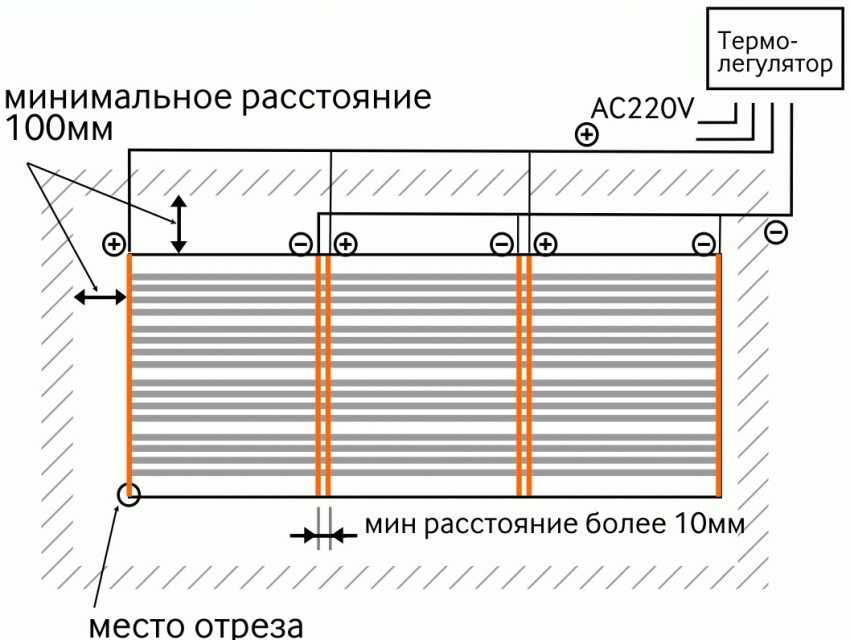 Для того чтобы избежать монтажных ошибок и других неожиданностей, специалисты советуют перед началом установки ИК пленки выбрать схему подключения и составить план проекта. Элементарная схема поможет не только грамотно рассчитать количество материала, необходимо в конкретном случае, но и подобрать необходимую по мощности пленку.