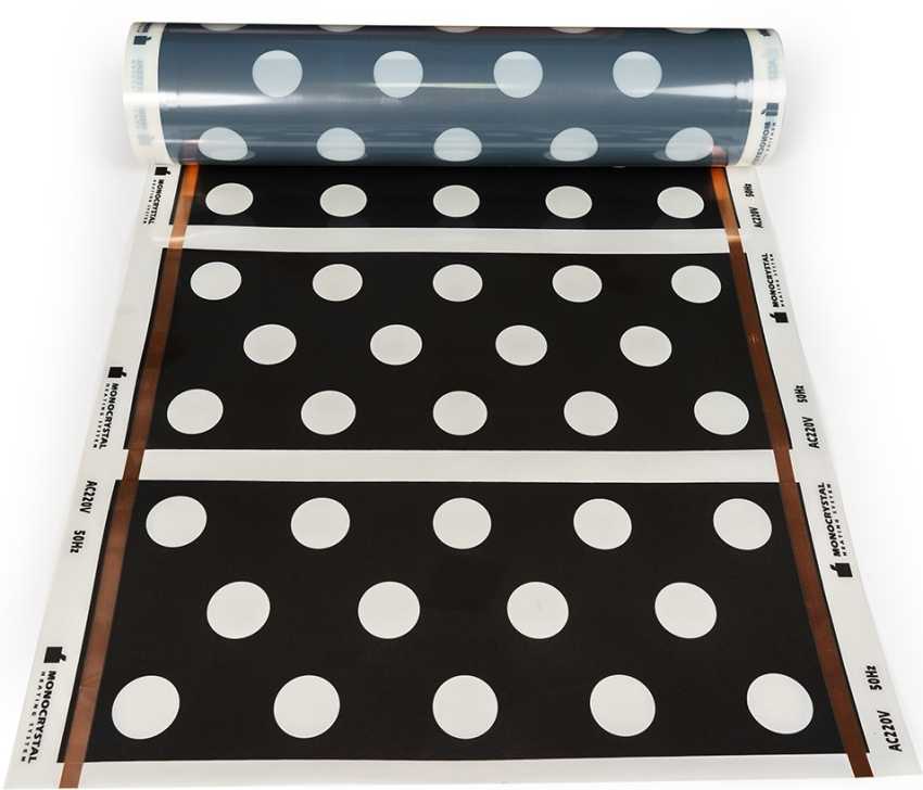 ИК пленка для пола — рулонный материал. Представляет собой пасту карбона, запаянную в полипропиленовую или полиэстерную пленку. По краям проходят токопроводящие шины (полосами) из серебра и меди. По этим шинам к углеродному материалу (обычно используют карбон) подается электрический ток. При прохождении электрического тока через карбон выделяется большое количество тепла. Полосы собраны в секции по несколько штук в одной. По разделительной полосе между секциями их можно разрезать, что удобно при монтаже. Такое строение хорошо еще тем, что при повреждении одной или нескольких полос вся остальная лента остается работоспособной. Так как расстояние между полосами совсем небольшое, то даже выход из строя нескольких элементов подряд никак не скажется на ощущениях: пол останется равномерно теплым. Ширина рулонов — от 50см до 100см, толщина пленки — от 0,2мм до 2мм.