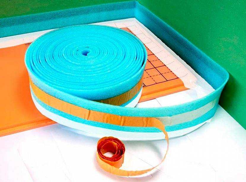 - По периметру помещения раскатывают и демпферную ленту. Это полоса теплоизоляционного материала, толщиной не более 1 см. Она предотвращает потери тепла на обогрев стен. Вторая ее задача — компенсировать температурное расширение, которое возникает при нагреве материалов. Лента может быть специальной, а еще можно уложить нарезанный полосами тонкий пенопласт (толщиной не более 1 см) или другой утеплитель такой же толщины.