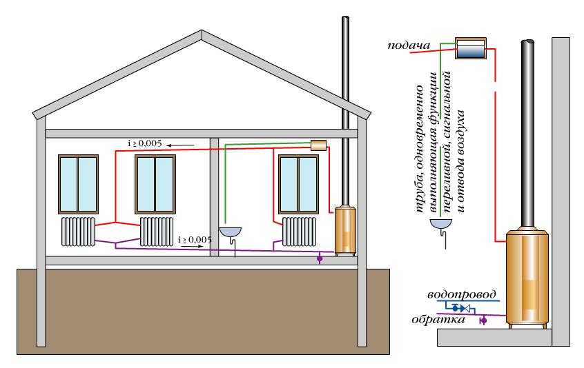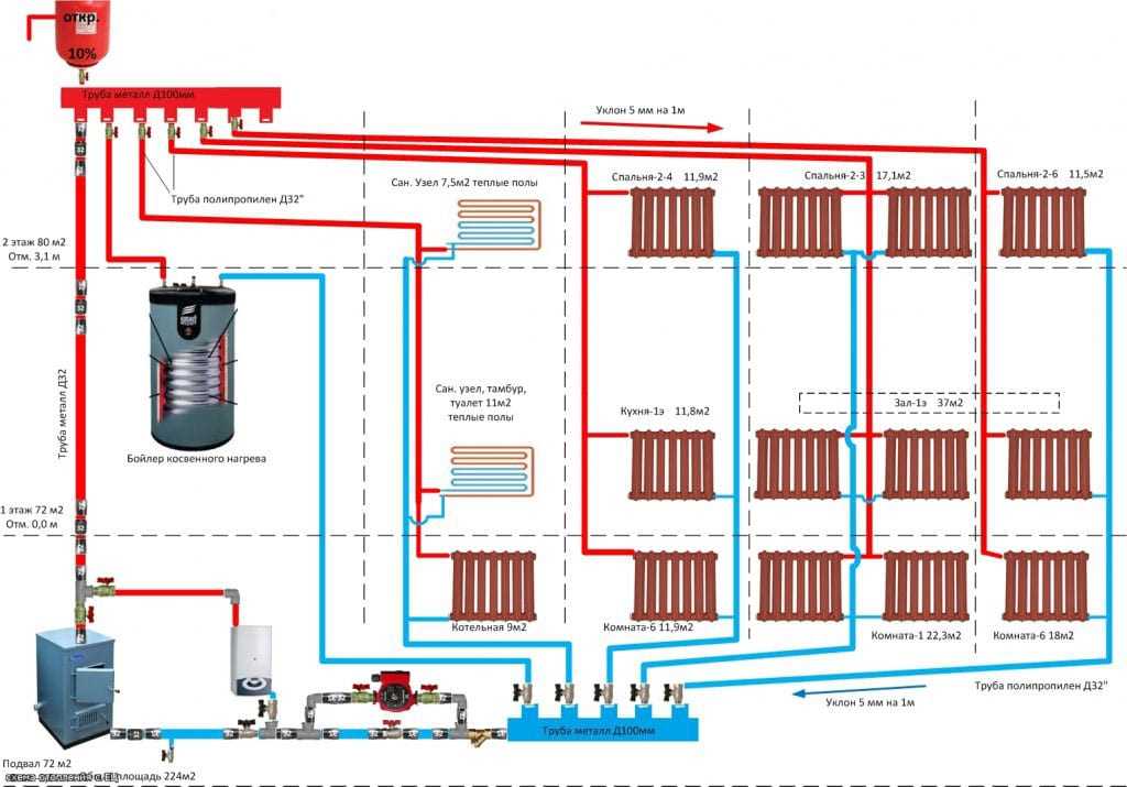 Стабильное давление определяется типом и мощностью котла, часто норма в границах 1,5 атмосфер. Дополнительным оборудованием, обеспечивающим безопасность работы системы отопления двухэтажного частного дома типа «ленинградка», служат: