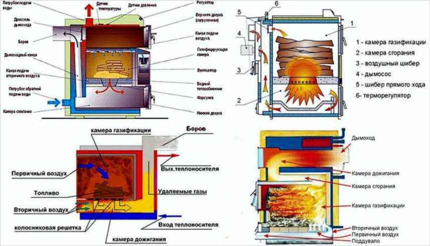 Компоновка дровяных котлов длительного горения предполагает расположение основной топочной камеры непосредственно над зоной сжигания вторичных газов, а сообщение между ними осуществляется через специальные керамические форсунки, способные работать при температуре от 800 до 1000 С. Днище главного топливного отсека оборудовано специальной термостойкой постелью, чаще всего из шамотного кирпича или керамобетонных блоков.