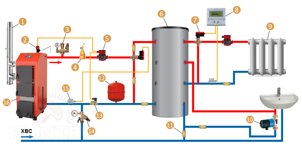 Схема подключения твердотопливного котла с теплоаккумулятором: 1 — дымоход; 2 — термостат; 3 — группа безопасности; 4 — сепаратор воздуха; 5 — циркуляционный насос; 6 — тепловой аккумулятор; 7 — трёхходовой смеситель; 8 — погодозависимоя автоматика; 9 — радиатор отопления; 10 — циркуляционный насос; 11 — обратный клапан; 12 — расширительный бак; 13 — защита от сухого хода; 14 — клапан подпитки; 15 — накладной датчик температуры; 16 — твердотопливный котёл
