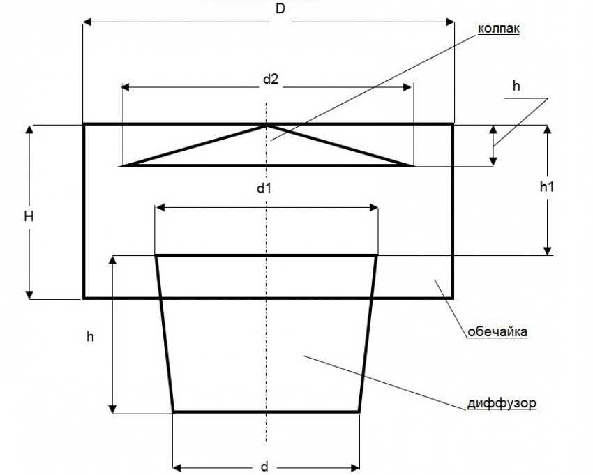 Эскиз дефлектора: d — диаметр трубы; d1 = d*1,26; d2 = d*1,7; h = d; h1 = d*0,7; h2 = d*0,25; D = d*2; H = d*1,2