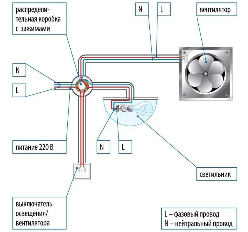 В самом простом варианте вентилятор в вытяжке санузла включается отдельным выключателем. Некоторые модели имеют цепочку, потянув за которую можно его включить или выключить. В таком случае работает устройство на протяжении всего времени пока полается электропитание. Есть и другие варианты: