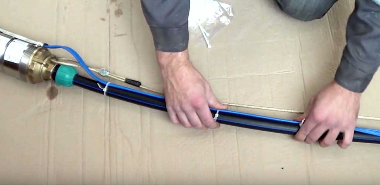 3. Производится крепеж скважинного насоса к страховочному тросу. Диаметр троса подбирается исходя из глубины скважины. Чем она больше, тем большая масса конструкции водопровода, но уже с водой в трубе тянуть вниз.
