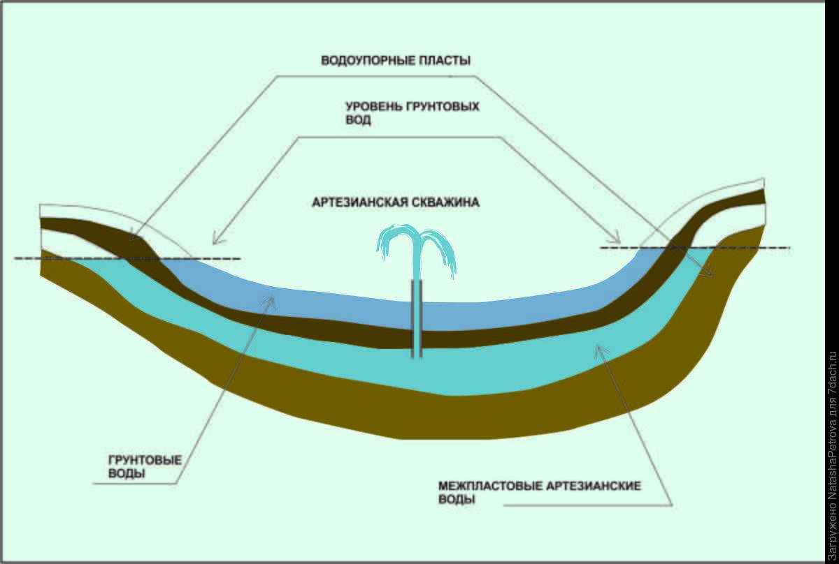 Расположение артезианской воды в пластах земли в сравнении с обычным колодцем