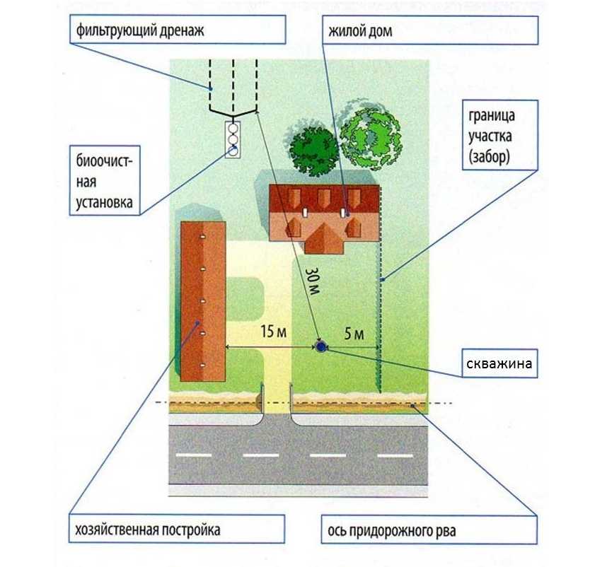 Скважина должна быть расположена так, чтобы были соблюдены расстояния, гарантирующие ее защиту от загрязнений