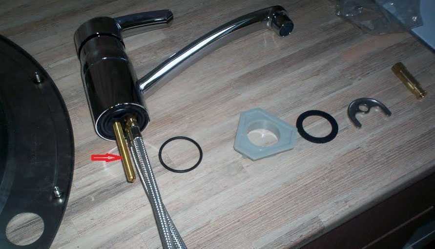 Теперь надо на корпус натянуть резиновую прокладку, которая герметизирует место соединение смесителя и поверхности мойки. Это резиновое кольцо приличного диаметра — идет в комплекте. Его протягивают через установленные шланги подводки, размещают на корпусе.