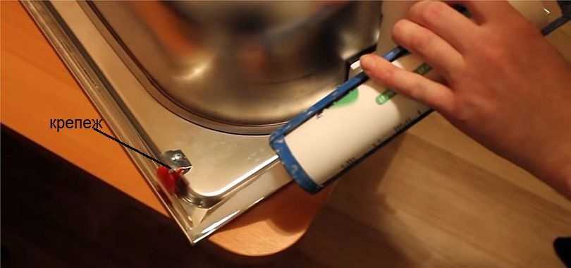 Теперь мойку с установленным на ней смесителем ставят в подготовленное место. Сначала с тыльной стороны раковины по периметру наносят силиконовый герметик (не акриловый — он быстро желтеет). Затем мойку устанавливают на место, затягивают крепежные болты.