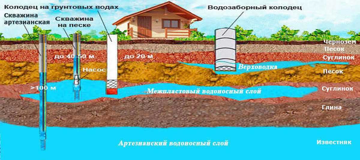 В зависимости от требуемых объемов использования или потребления, на участке можно соорудить различные типы водных источников. Но также выбор будет зависеть от того, на какой глубине удалось обнаружить воду.