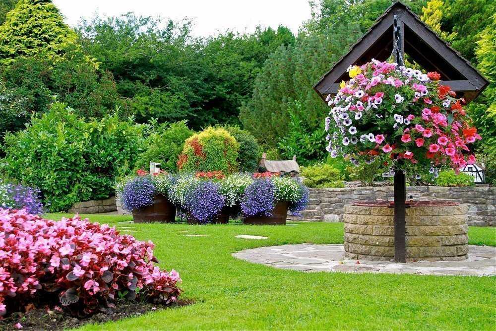 Хорошо смотрится декоративный колодец, вокруг которого посажена газонная трава, низкорослые кустарники, вьющиеся растения, как показано на фото