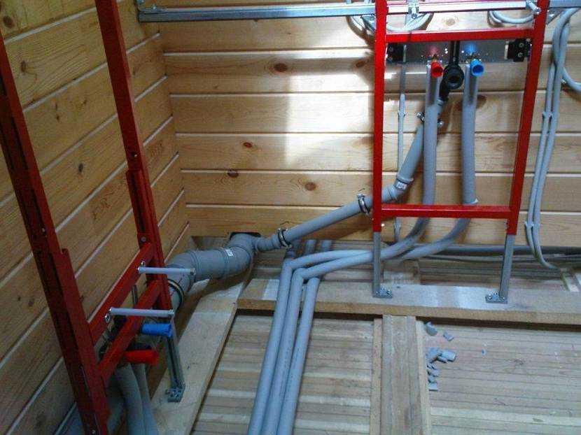 Первый шаг — разводка труб от каждого прибора до стояка. Диаметр трубы у ванны, душа, раковин и моек — 50 мм, у унитаза — 100 мм. У всех сантехнических приборов монтируются колена, препятствующие попаданию в помещения неприятных «ароматов» из канализации. При монтаже и крепеже трубопровода необходимо учесть уклон (примерно 3 мм на метр). Стояк выводится над коньком и накрывается решеткой. Отверстие для вывода к наружному трубопроводу не должно быть меньше, чем 30×30 см.
