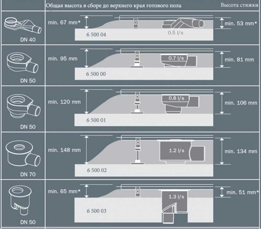 Размер подбирается согласно диаметру трубы канализации от 40 до 100 мм. Высота определяется общей толщиной пола – слив не должен возвышаться над плоскостью.