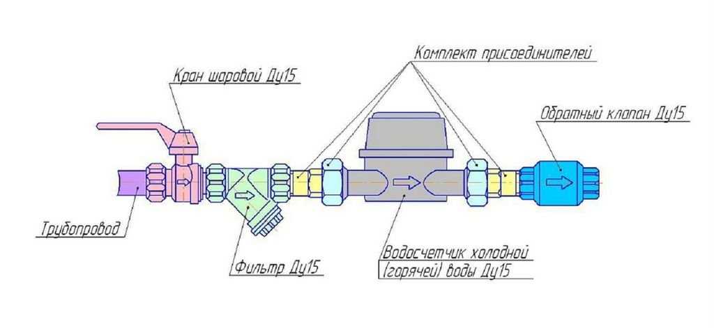 Схема монтажа водосчетчика является универсальной для большинства типов.