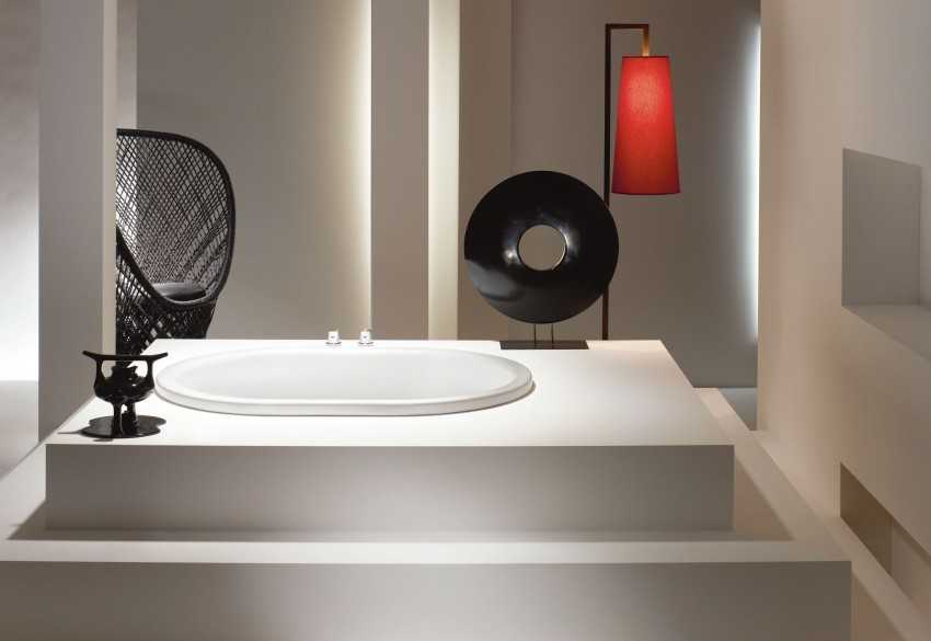 В идеале расстояние от стены и других предметов должно составлять не менее полуметра. При этом необходимо придерживаться осевой либо асимметричной интерьерной композиции. Реже такую ванну устанавливают в нишу, выдерживая положенное расстояние.