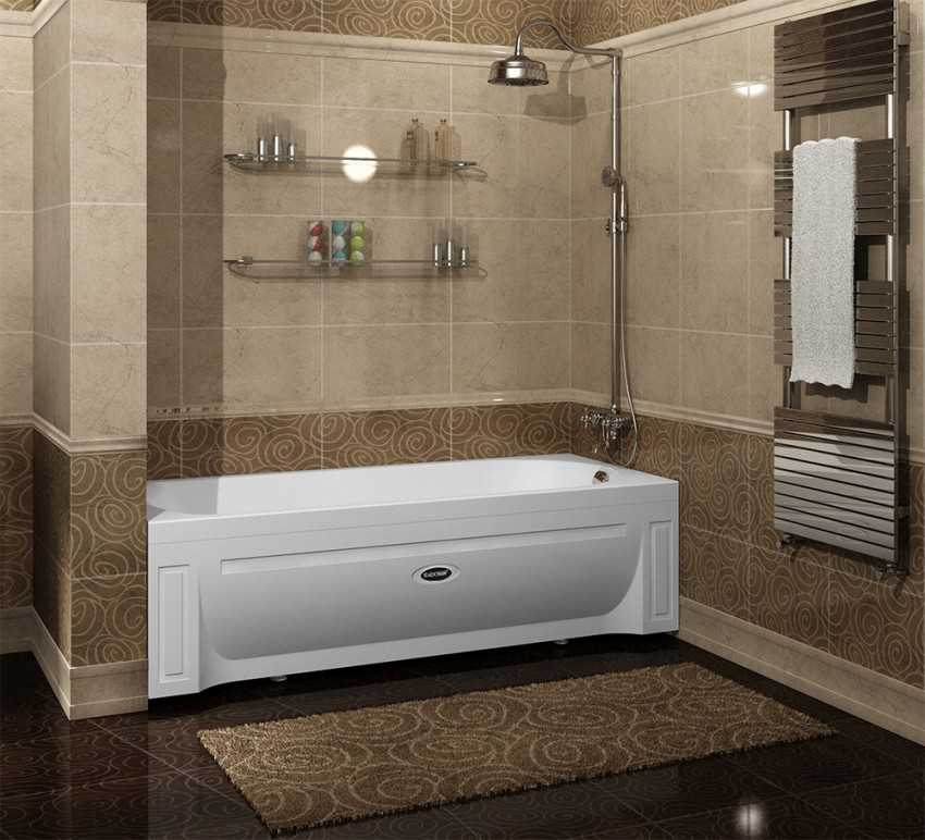 Лицевая плоскость чаще всего закрывается декоративным экраном, маскирующим неприглядно выглядящее пространство под ванной. Скрытая часть может использоваться для хранения бытовой химии, моющих средств и тому подобных вещей. Приобрести готовый экран несложно, не вызывает каких-либо затруднений и его монтаж. Вариантов экранов очень много, и всегда можно подобрать оптимальный для себя его внешний вид.
