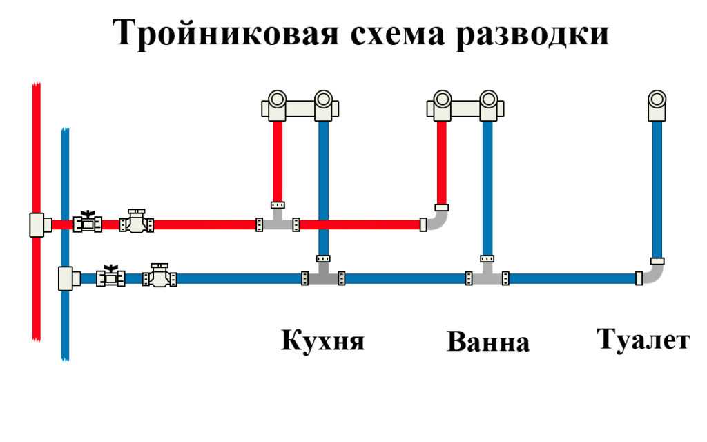 Такой способ соединения более экономичный, для его выполнения требуется меньшее количество труб, фитингов, он простой в монтаже. Разводка труб при тройниковой системе более компактна, ее легче спрятать под отделочными материалами.