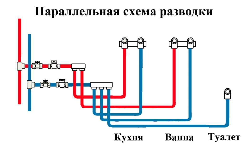 Параллельное подключение основывается на подведении отдельных труб от главного коллектора к точкам водозабора. Для холодной и горячей магистрали устанавливают свои коллекторные узлы.
