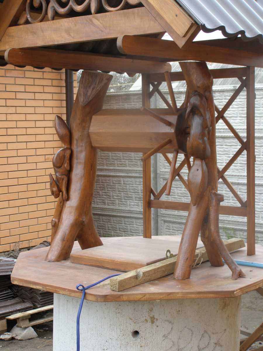 - Удерживающие крышу столбы, приукрасить замысловатой резьбой. Одним словом, каждая деталь колодца может стать произведения искусства, но нужно следить, чтобы все выдерживалось в одном стиле.