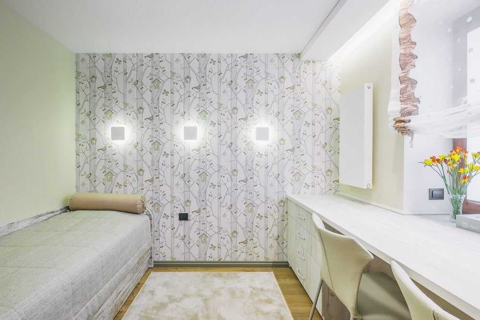 Для этого способа потребуется два вида обоев: простые, однотонные и яркие, с оригинальным рисунком, привлекающие к себе внимание. Первыми оклеивают три стены, а вторыми — оставшуюся четвёртую