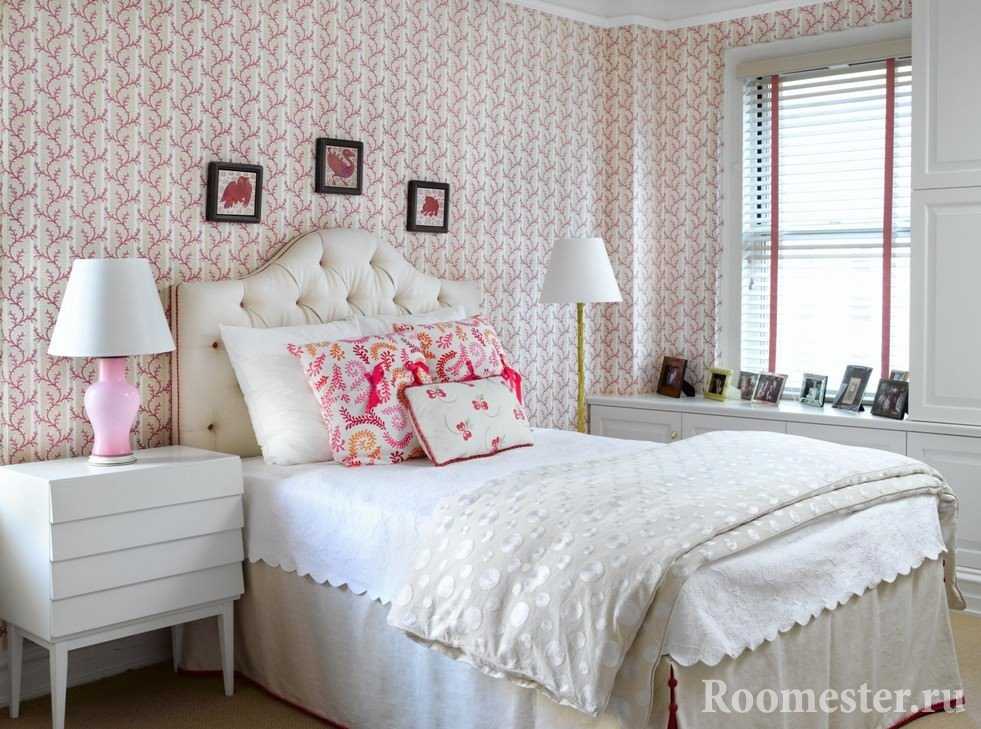 Любопытный дизайнерский ход заключается в применении комбинированных обоев в интерьере спальни.