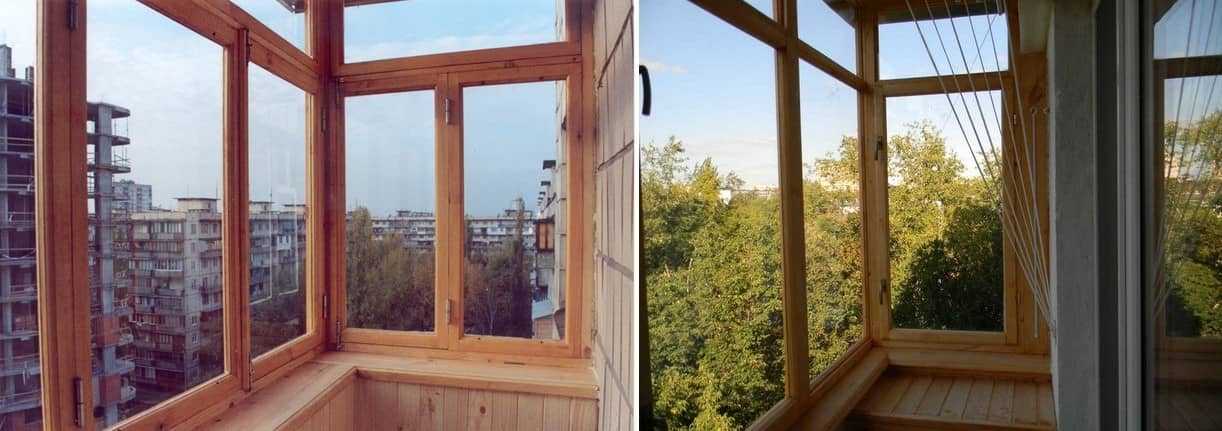 Деревянные рамы редко используют для холодного остекления, из-за воздействия на этот материал погодных условий, он не выдерживает долгого срока службы. Дерево является тяжелым, и не все бетонные плиты способны выдержать подобную нагрузку. Плюсы деревянного остекления — природный материал лучше удерживает тепло, поэтому чтобы надолго сохранить ремонт в лоджии, нужно будет ежегодно обрабатывать все детали специальными антисептическими средствами и покрывать сверху краской или лаком.