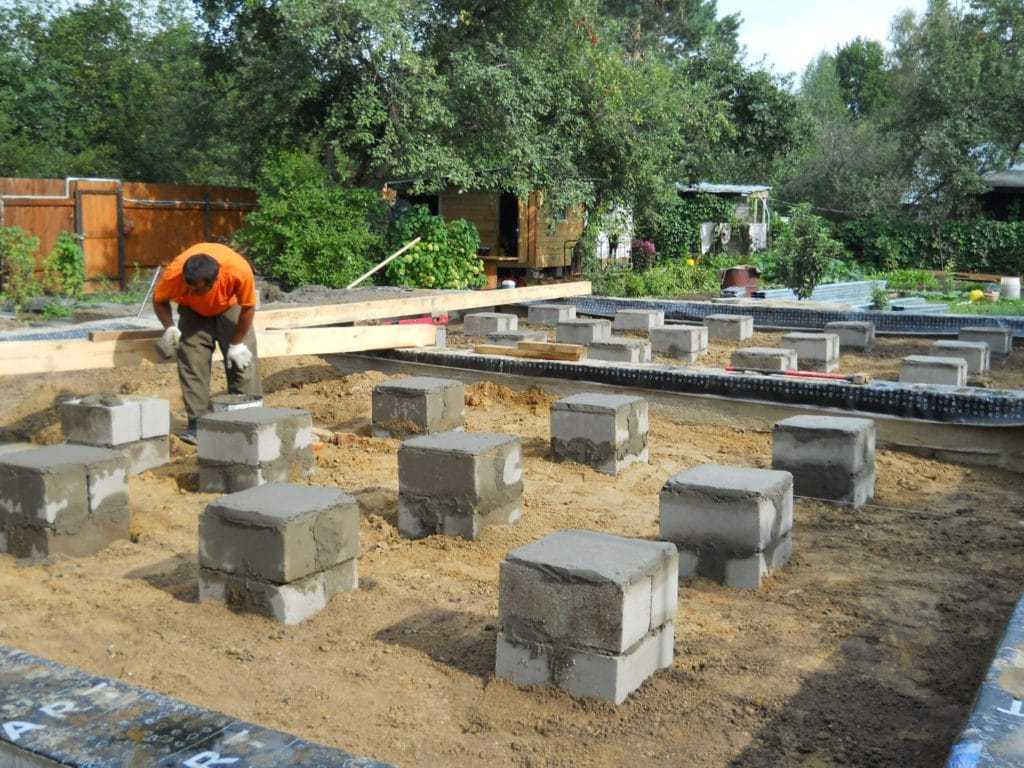 При закладке столбчатого или ленточного варианта подошвы основания также задействуют фундаментные блоки или керамический кирпич.