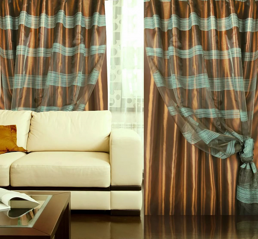 Прекрасный вариант – оформить маленькое окно двусторонней шторой. В некоторых местах можно сформировать драпировки, показывая изнаночную сторону занавески – это сделает оконное обрамление более интересным.