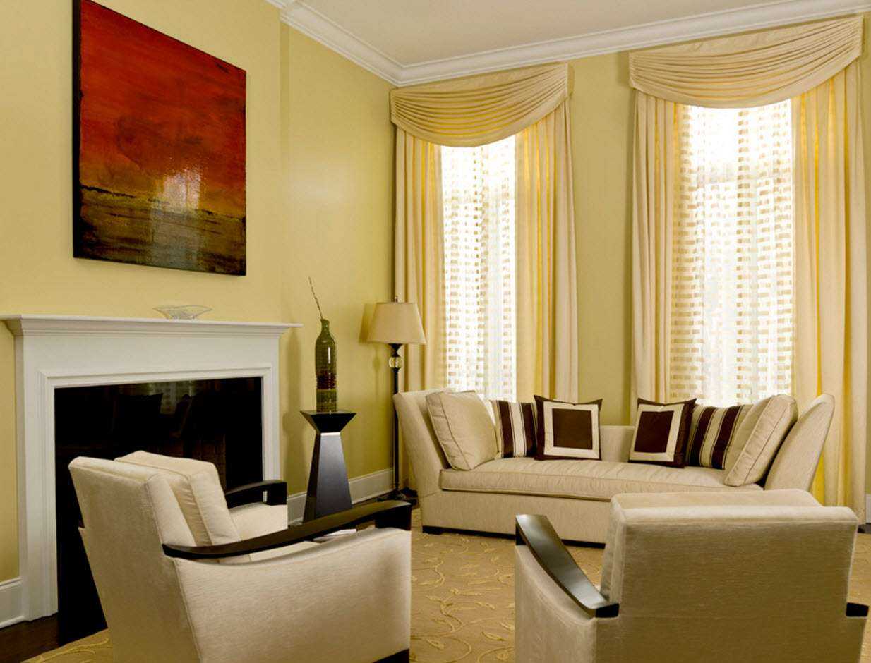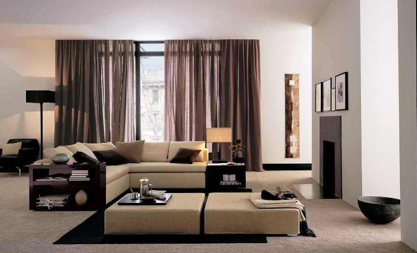 Если надо обозначить грани пространства в маленькой комнате, шторы лучше выбирать светлые. Красиво смотрятся серые и бледно-желтые полотна на противоположных окнах. Для угловых окон подойдет монохромная расцветка.