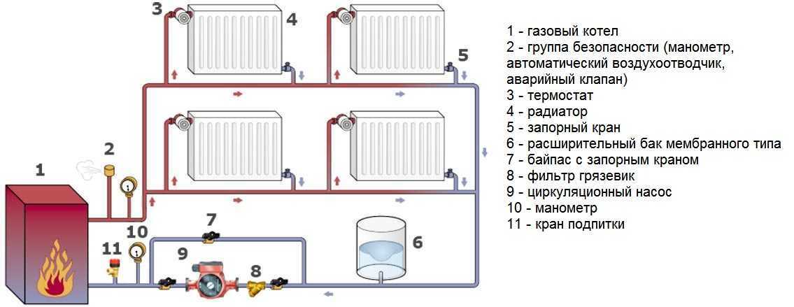 Газовое отопление частного дома сделанное по этой схеме будет наиболее надежным: если повредиться один из трубопроводов, все остальные будут работать. Потому такой способ часто выбирают если трубы прячут в стяжку.