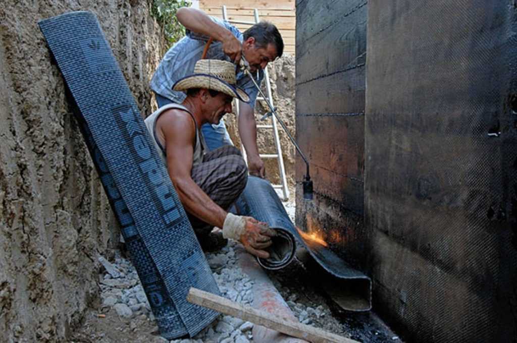 - монтаж изоляции зависит от выбранного материала (для оклеечной сначала наносят слой мастики, а потом прикладывают рубероид или стеклоизол; чтобы закрепить наплавляемую изоляцию ее нижнюю поверхность нагревают горелкой или строительным феном и крепят на ленту фундамента);