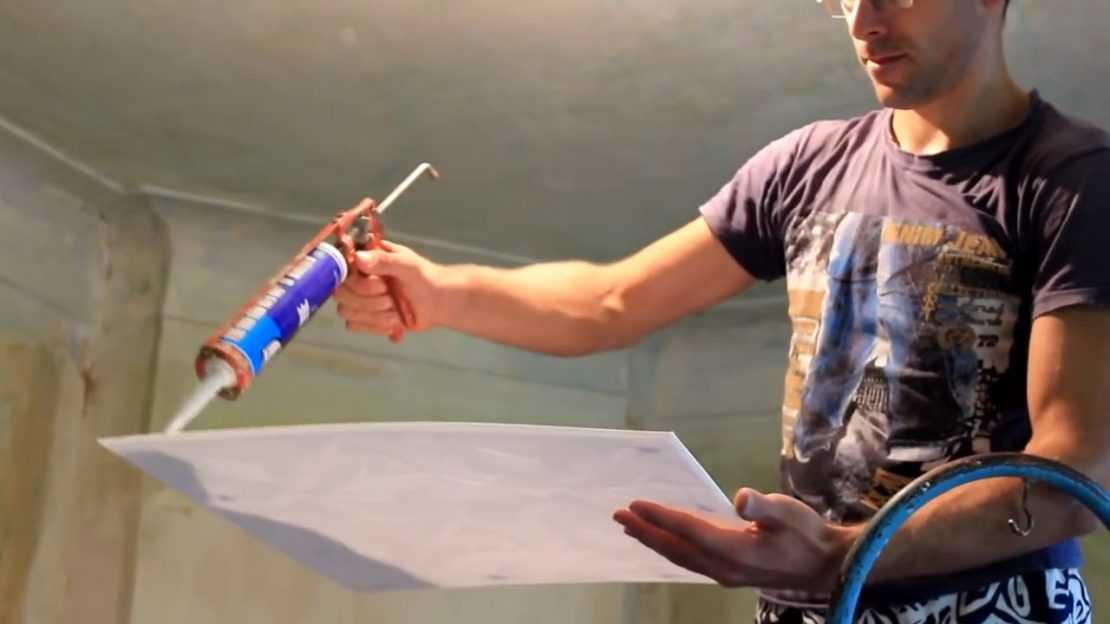 Затем снова наносится состав на потолок, и, снова, примерно на 4 плитки. Все они выставляются в одной плоскости или хотя бы так, чтобы не было резких перепадов. Только при этом надо следить, чтобы необходимый слой клея не рос слишком быстро — больше 3-5 мм лучше не наносить, иначе все упадет.