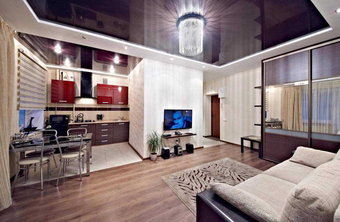 - если помещение ограниченных размеров, отличным решением может стать использование зеркальной поверхности потолка. Использование этого приема визуально расширит пространство и создаст ощущение бесконечности потолка.