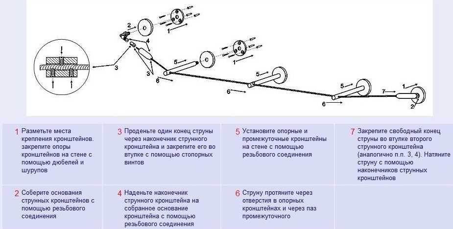 - Струнные карнизы можно размещать как на потолке, так и на стенах. В определенных точках крепления просверлите отверстия, забейте пластиковые дюбели, привинтите шурупами, вставьте струну, зафиксируйте и натяните ее с помощью натяжного устройства, расположенного на креплении.