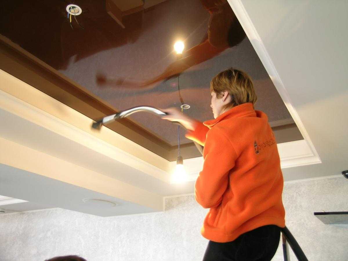Для сухой уборки от пыли достаточно мягкой тряпки, но удобней это сделать пылесосом. Включите его на минимальную мощность и, если нет специальной насадки, соберите пыль, держа шланг на небольшом расстоянии от потолка. Так тонкое покрытие не засосёт внутрь пылесоса. Предварительно проверьте, насколько хорошо закреплено и натянуто полотно.
