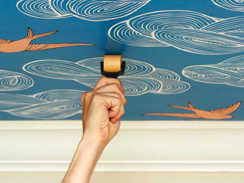 Оклейка проходит так — полотно обоев прикладывают к потолку, обработанному клеем. Потом проходят его шпателем
